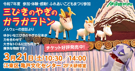 2026年3月21日に亀戸のふれあいこどもまつりにて「三びきのやぎのガラガラドン」を上演いたします。!今回は、ポポロで長く上演してきた人気作品「三びきのやぎのガラガラドン」を上演します。