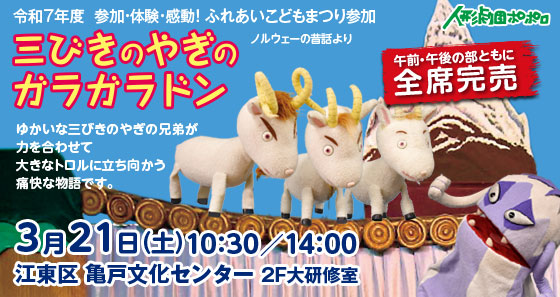 この作品は、ポポロで長く上演してきた人気作です。三びきのやぎ兄弟が知恵と力を合わせ、橋の下の大きなトロルに挑む大冒険の物語。ご来場いただく皆さまとお会いできることを楽しみにしています。